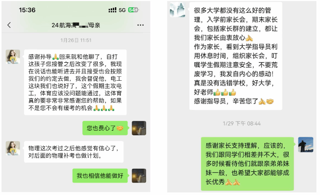 在日常广泛沟通的基础上,学院着力推动假期关怀从“面上覆盖”向“点上精准”深化。各中队指导员聚焦学业困难、心理困扰、经济困难等不同类型学生,通过电话、微信语音等方式与家长开展“一对一”深度沟通,与家长共话助力学生成长进步方法措施,传递学院关心关怀,进一步凝聚家校协同育人有效合力,让家校共育的“同心圆”更加坚实。