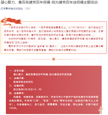 本次活动共分为两个阶段,6月23日,开展线上活动,活动依托学院学生第七党支部基层党建创新建设项目,通过微信公众号征集学院师生对建党百年的真挚祝福;6月30日,开展线下送祝福主题签名活动,活动中,学院师生在“航海师生热烈庆祝中国共产党成立100周年”条幅上签名送祝福,庆祝党的百年华诞。活动最后,学院党委为参与活动的师生赠送建党百年纪念品。
