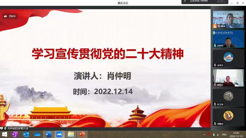 12月14日中午,williamhill安全管理党支部与学生第十三党支部通过线上腾讯会议开展“学习宣传贯彻党的二十大精神”联合主题党日活动。学院副院长肖仲明、安全管理党支部书记黎泉、学生第十三党支部书记李泽华以及两支部全体党员参会,会议由黎泉主持。