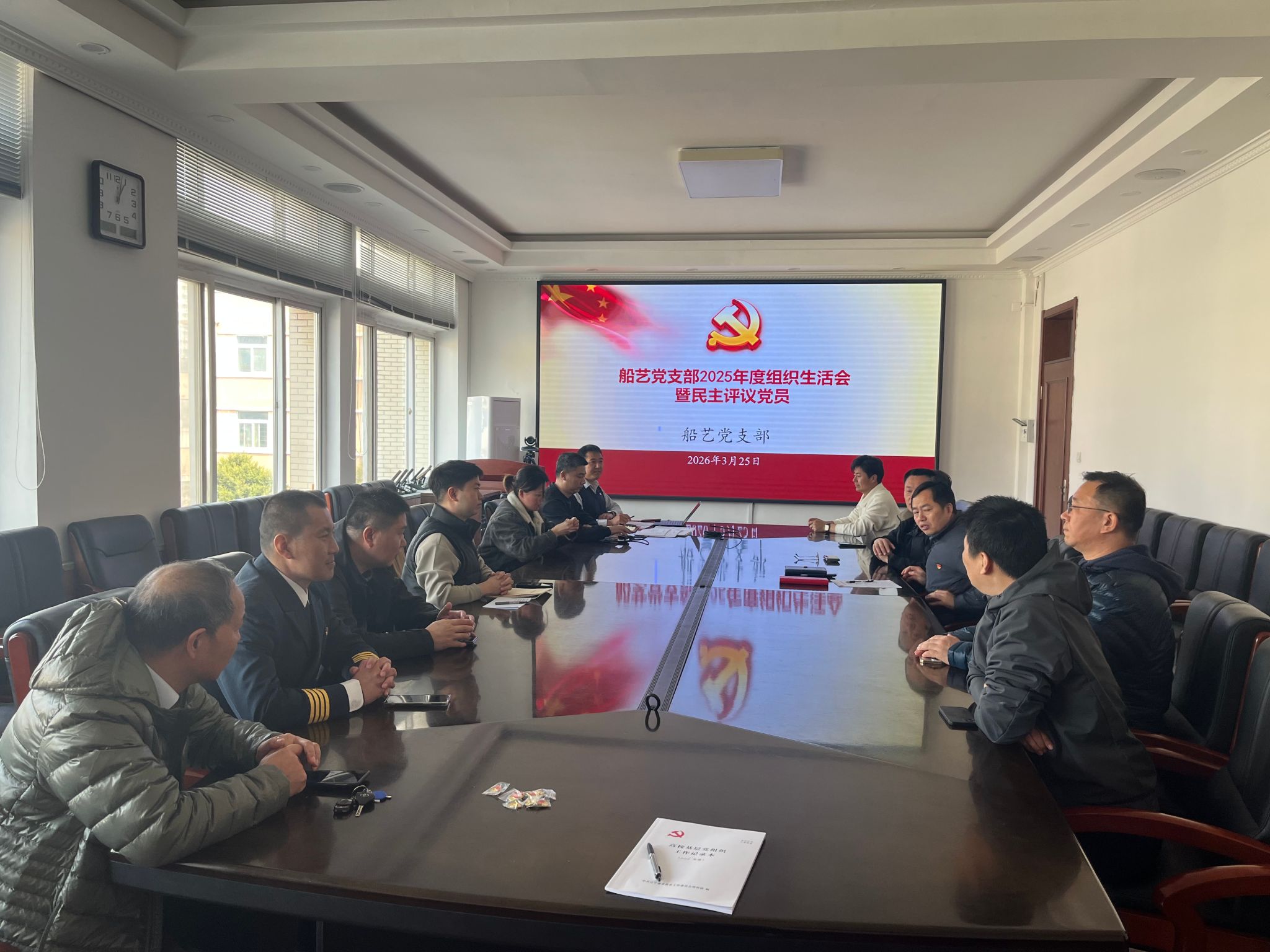 首先,支部书记李伟峰代表支委会从思想建设、组织建设、作风建设、党风廉政建设等方面汇报了船艺党支部2025年开展的工作和取得的成绩,并深入查摆了存在的问题和不足。随后,全体党员对党支部委员会的工作进行了评议。