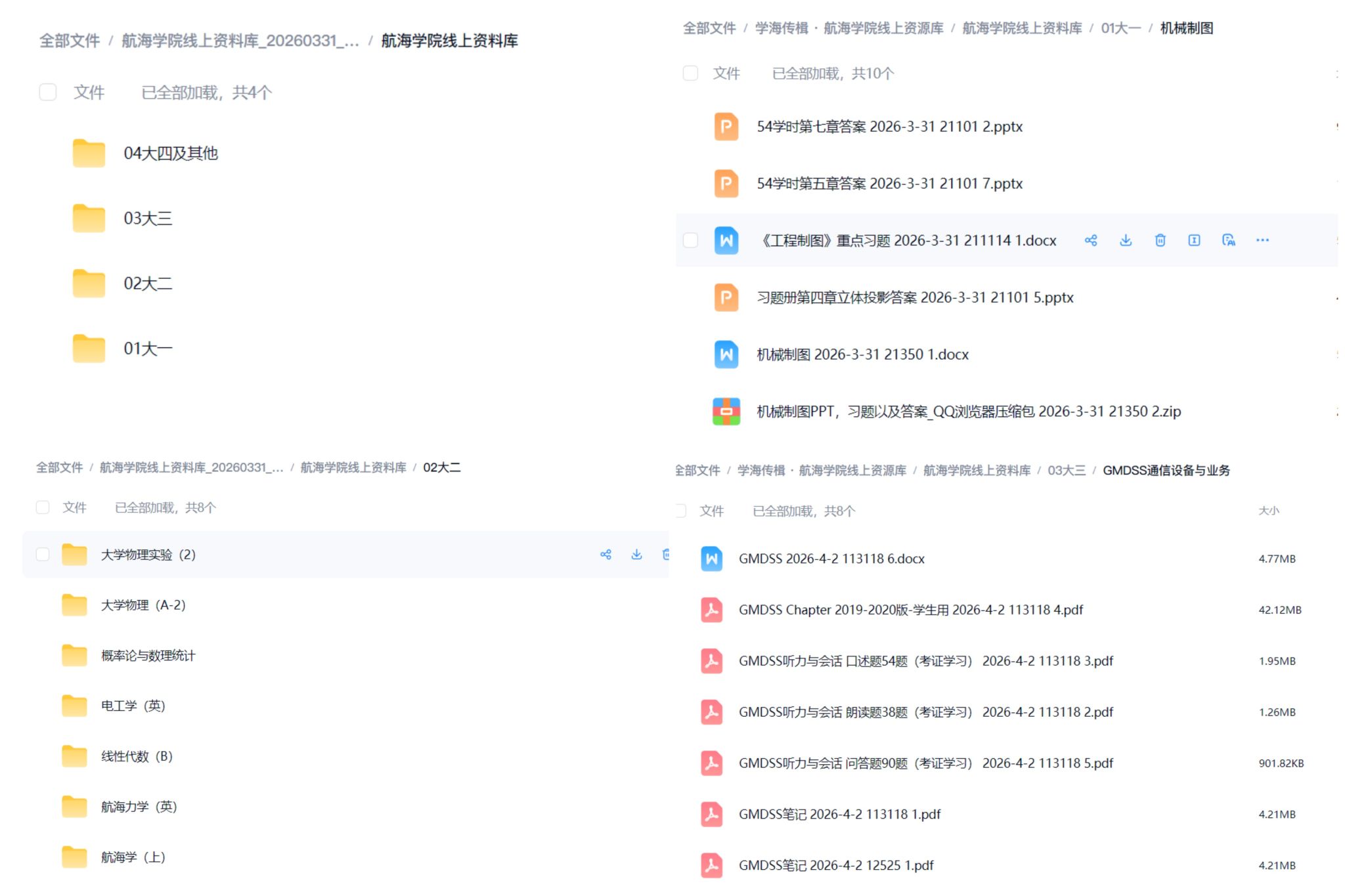 资源库围绕同学们成长全过程,构建分层递进、内容丰富的学习资源体系。按照年级划分,大一至大四分别聚焦基础夯实、专业提升、能力拓展与发展导向,形成循序渐进的学习支持路径;在内容上,系统整合真题与模拟题、学霸笔记与课程课件、重点难点微课资源,并同步纳入英语四六级备考资料以及考研、考公与科创指导等资源,实现知识巩固、能力提升与发展规划的有机衔接,有效覆盖从日常学习到考核复习、从学业进阶到多元发展的全过程需求。