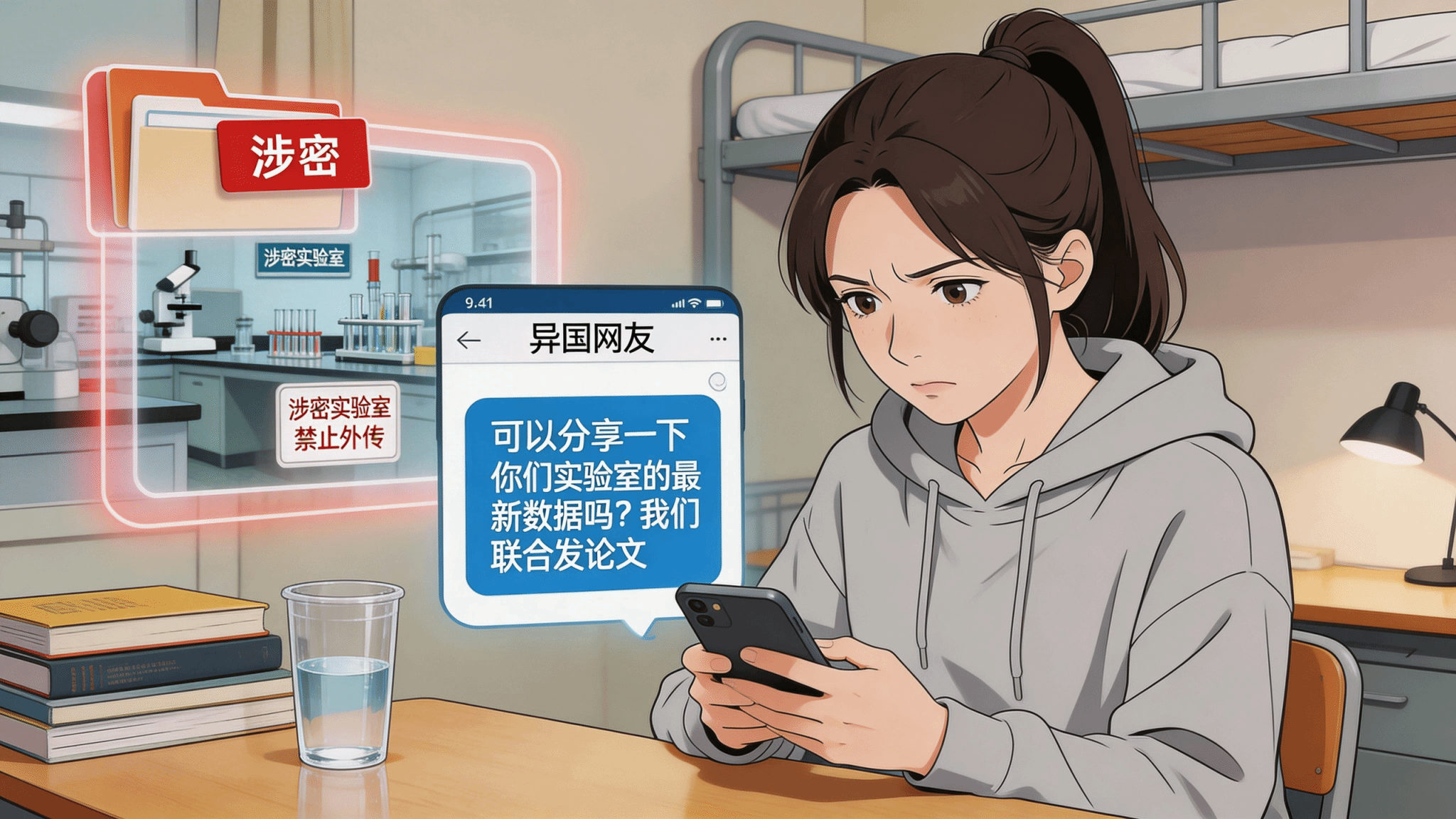 案例1(境外渗透类):境外人员伪装“异国网友”“学术伙伴”,以交友、联合发论文为由,套取专业科研数据、校园涉密场所照片。