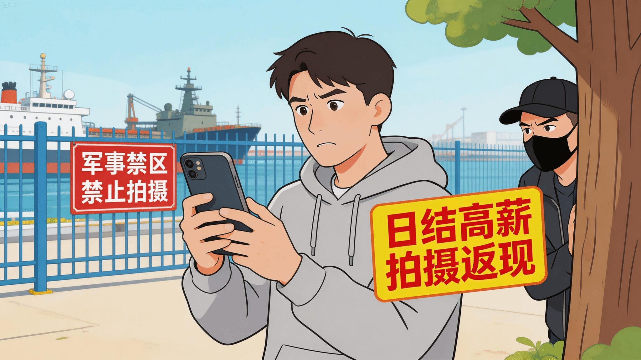 案例2(境外渗透类):境外机构以“日结高薪”为诱饵,招募大学生拍摄军事禁区、港口等敏感地点,或收集国内政策、民生信息。