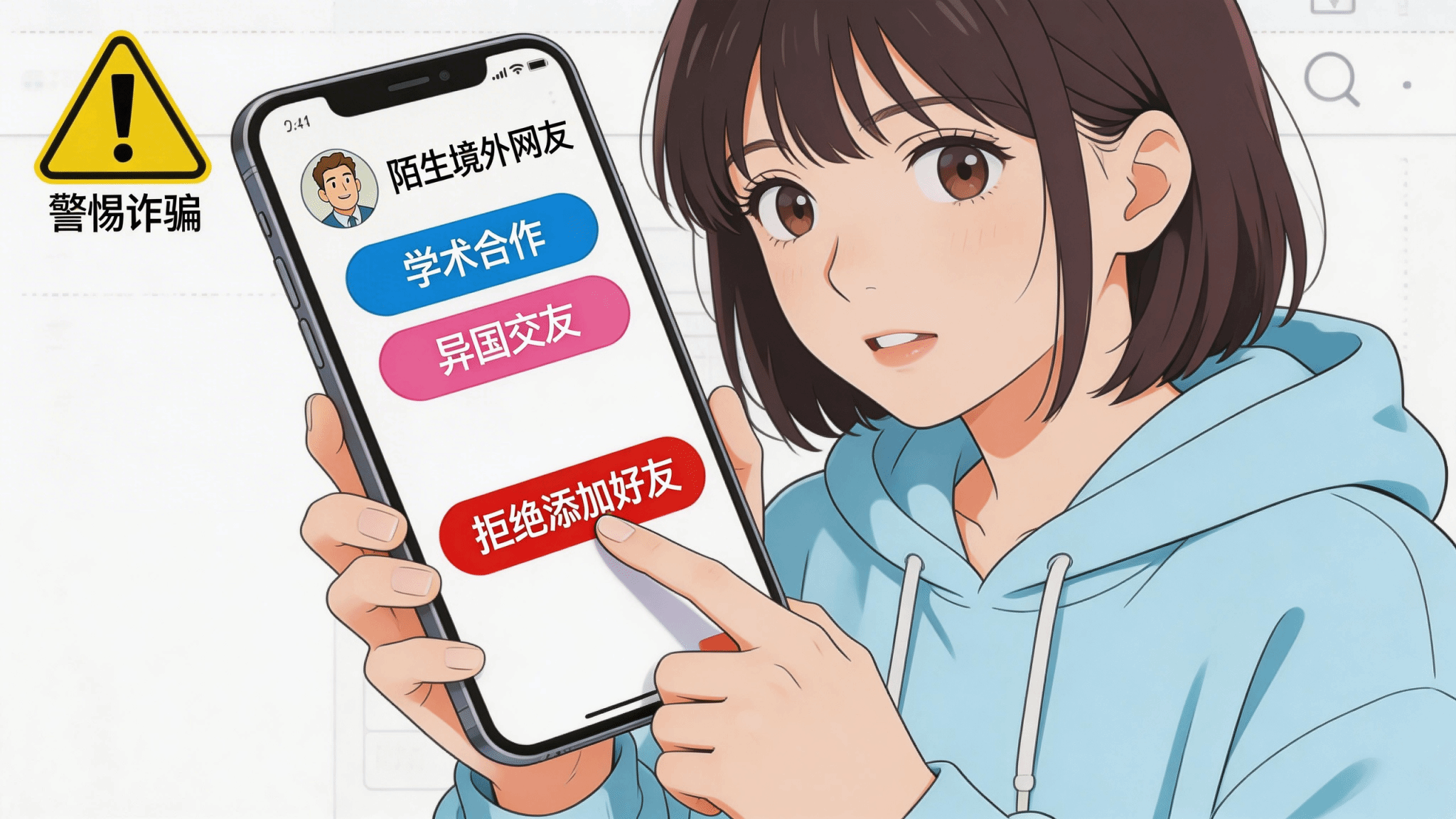 谨慎交友合作:不随意添加陌生境外好友,警惕“学术合作”“异国交友”等伪装,不向不明人员透露任何敏感内容。