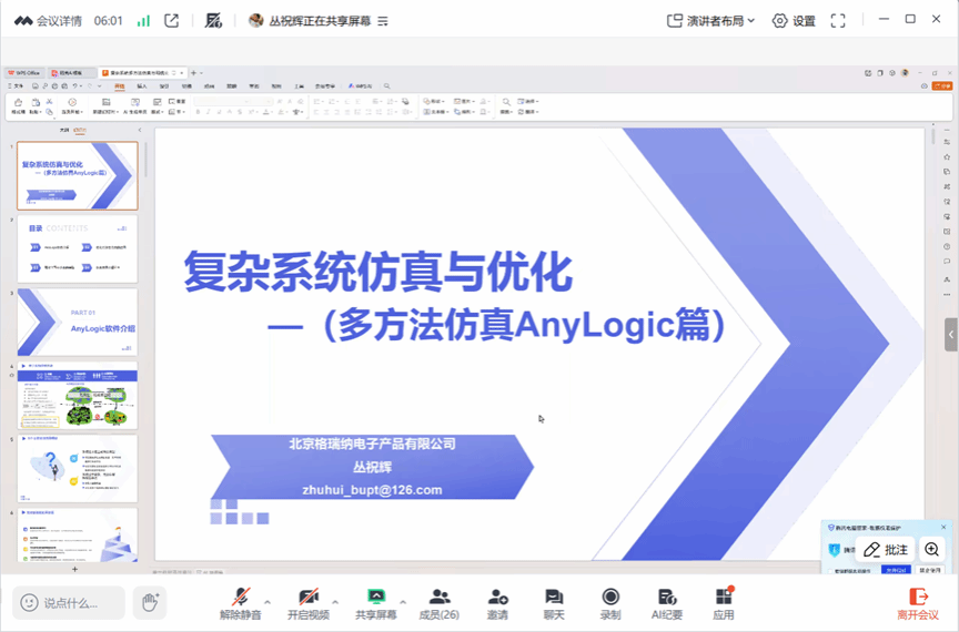 报告中,丛祝辉首先指出,仿真技术作为提升港口与客船等海上交通工具安全性、验证运营方案效率的关键手段,能在无风险、低成本的虚拟环境中有效预测运行瓶颈与安全隐患。随后,他系统介绍了AnyLogic平台所支持的多方法融合建模框架,涵盖智能体仿真、离散事件仿真与系统动力学的一体化应用,并重点阐述了该技术在高密度、动态复杂的港口与交通场景中具有的重要价值。